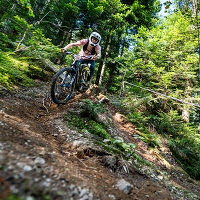 Sentiers exposé nord dans les sous-bois, virages appuyés et rochers saillants au rendez-vous.